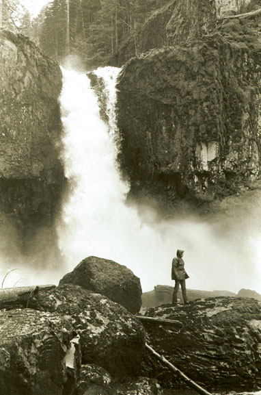 This view of Stein Falls shows Doug standing at the edge of the debris that rings the base of the falls. From this perspective, it appeared to the expedition members that it would be possible to walk behind the falls in low water. The amount of debris churning down the river and hurtling over the falls made it unsafe to attempt such passage in high water, however. These photos are ©Tom Kloster 1983, and may not be reproduced or used without permission Next Image from the March 1983 Expedition > < Back to Index Page