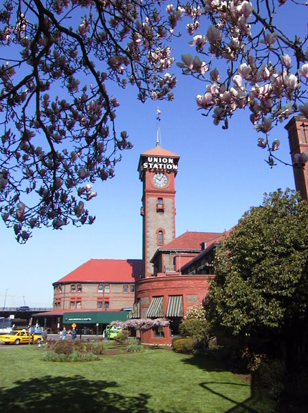 Historic Union Station South Lawn Tower View Tha main clock tower framed by early Magnolia blooms. Next Image > ©2001